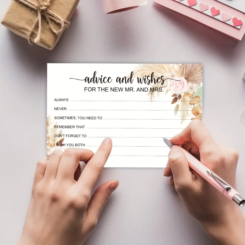 Maak je bruiloft onvergetelijk met onze Bruiloft Advieskaarten uit de Boho Blush Collectie. Deze set van 50 prachtig ontworpen kaarten biedt een uniek alternatief voor een traditioneel gastenboek en is perfect voor een Bohemian bruiloft. Met de titel “Advice & Wishes for the New Mr & Mrs” nodigen deze kaarten je gasten uit om persoonlijke tips, wensen en lieve woorden achter te laten voor het pasgetrouwde stel.