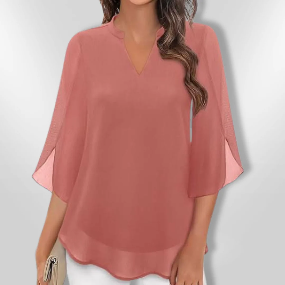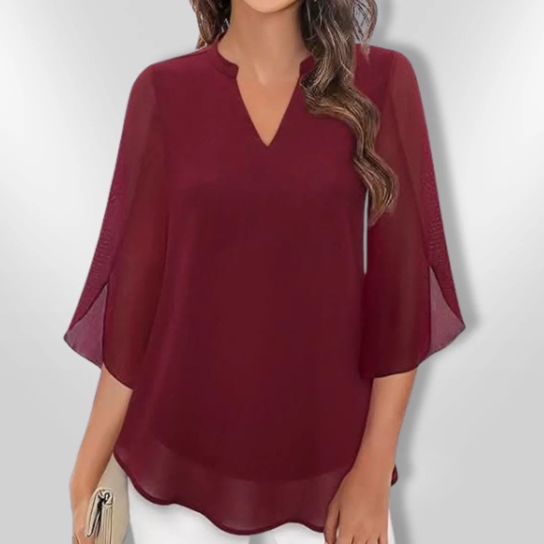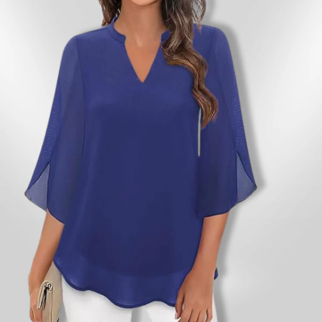 Met een moderne V-hals en een vloeiende silhouette, is deze blouse perfect voor zowel casual als formele evenementen. De lichte, gelaagde stof creëert een flatterende look die elke outfit naar een hoger niveau tilt.