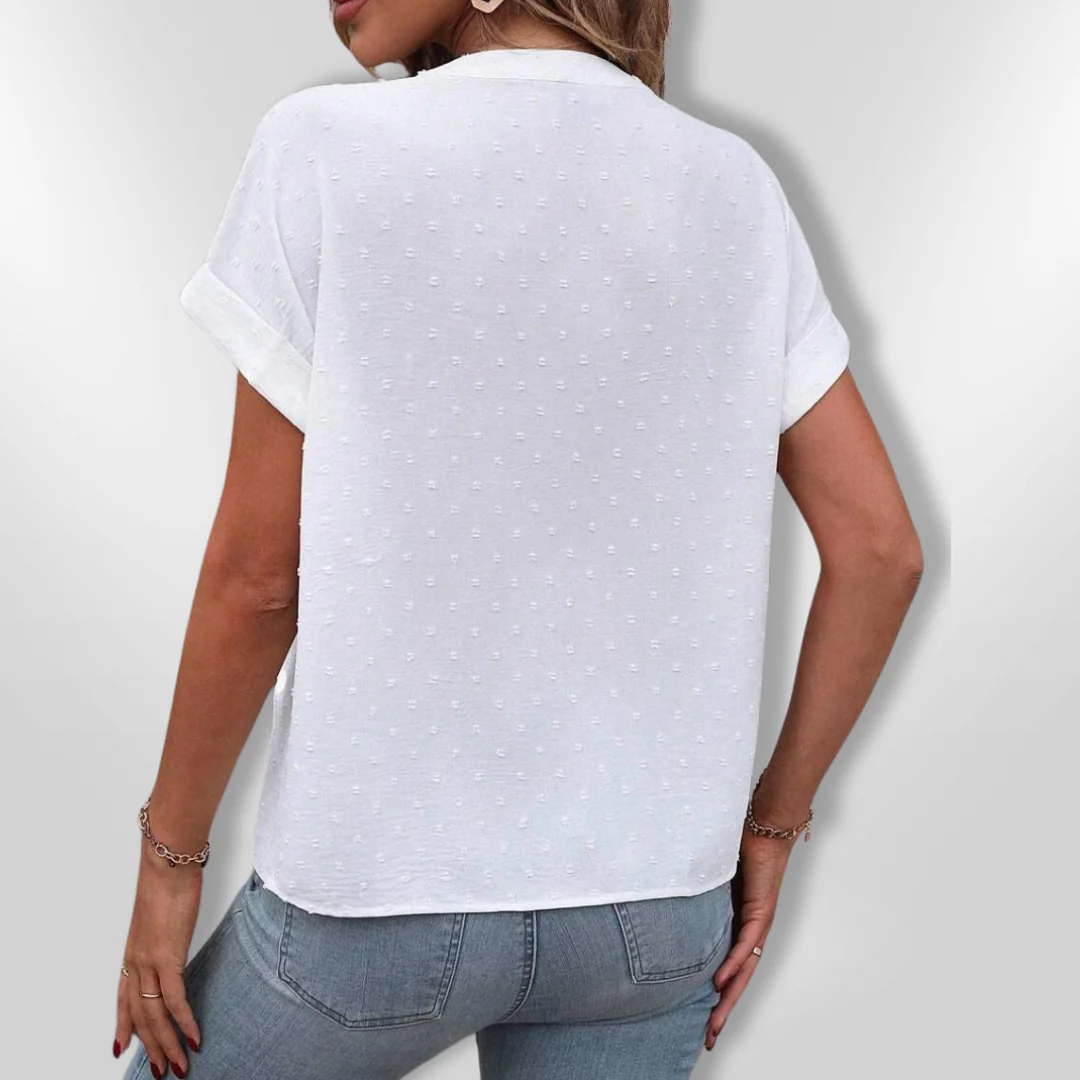 Deze blouse is perfect voor zowel een ontspannen als een chique look. De delicate details en het ademende materiaal maken het een veelzijdige keuze voor elke gelegenheid.