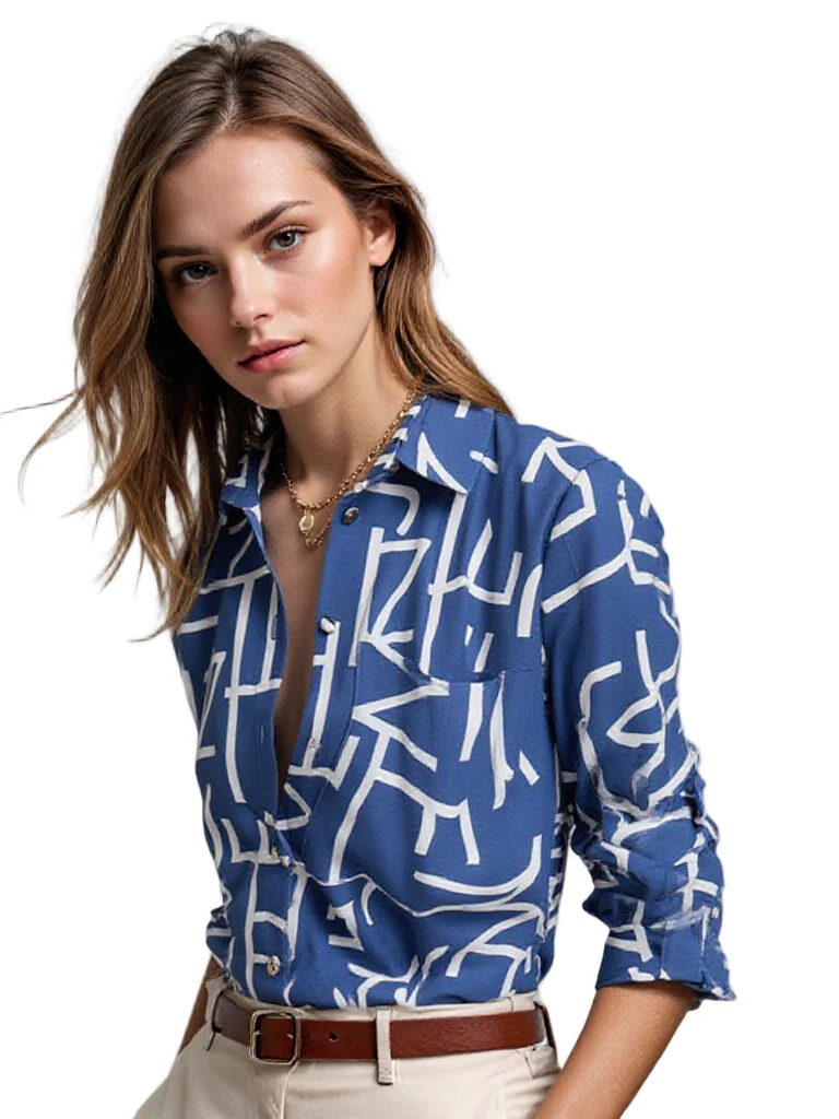 Voel je zelfverzekerd en stijlvol in deze blouse met omslagkraag. Het is de perfecte aanvulling voor je lente-garderobe, waardoor je elke gelegenheid met flair kunt tegemoet treden.