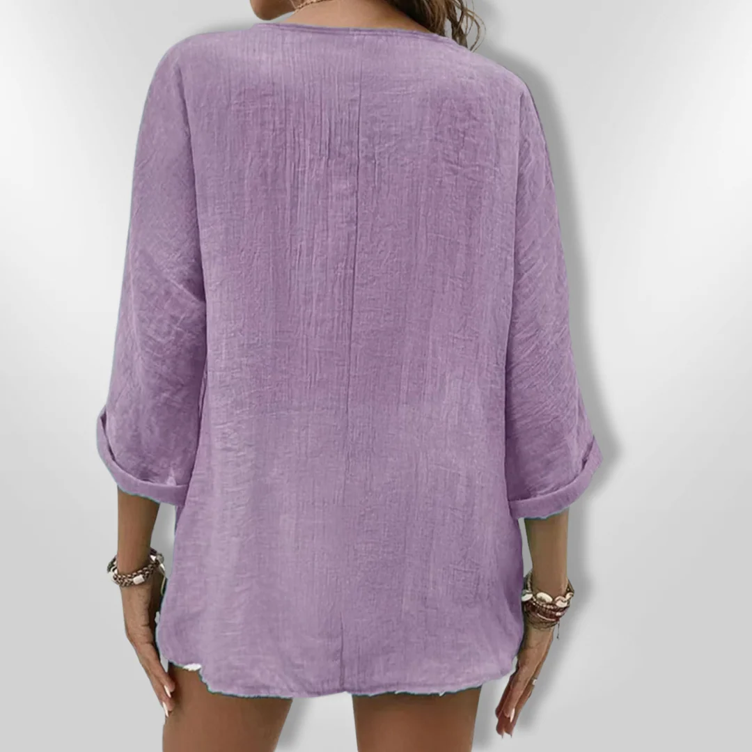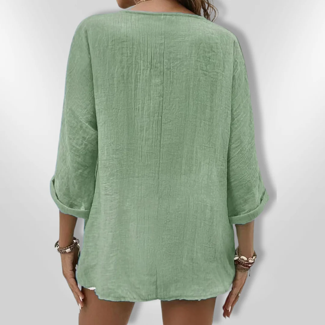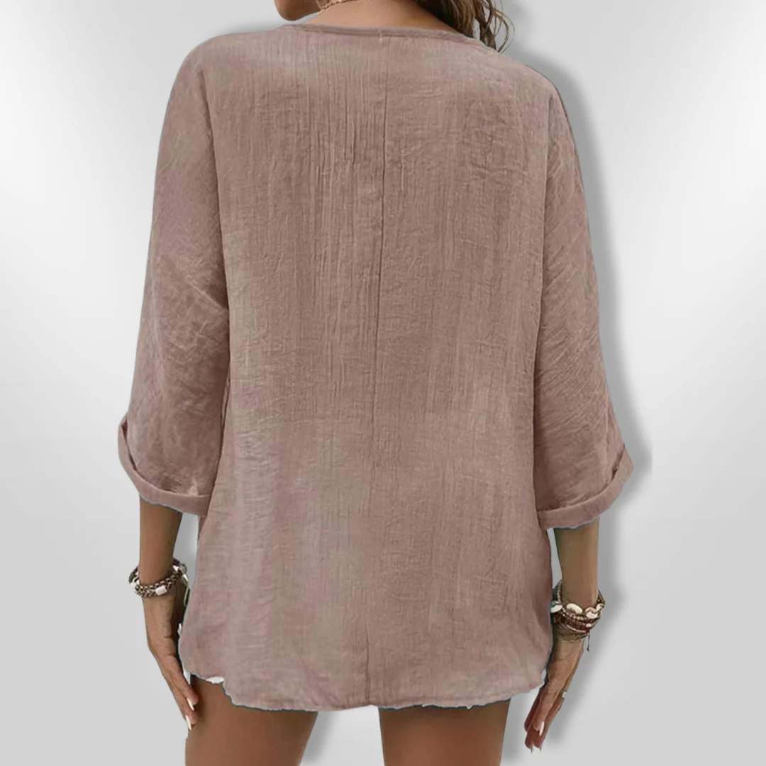 Met een relaxte pasvorm, een knoopsluiting aan de voorkant en opgerolde mouwen, is deze top veelzijdig genoeg voor zowel casual uitjes als een dagje aan het strand. De V-hals geeft een verfijnde uitstraling die moeiteloos elegantie toevoegt aan je look.