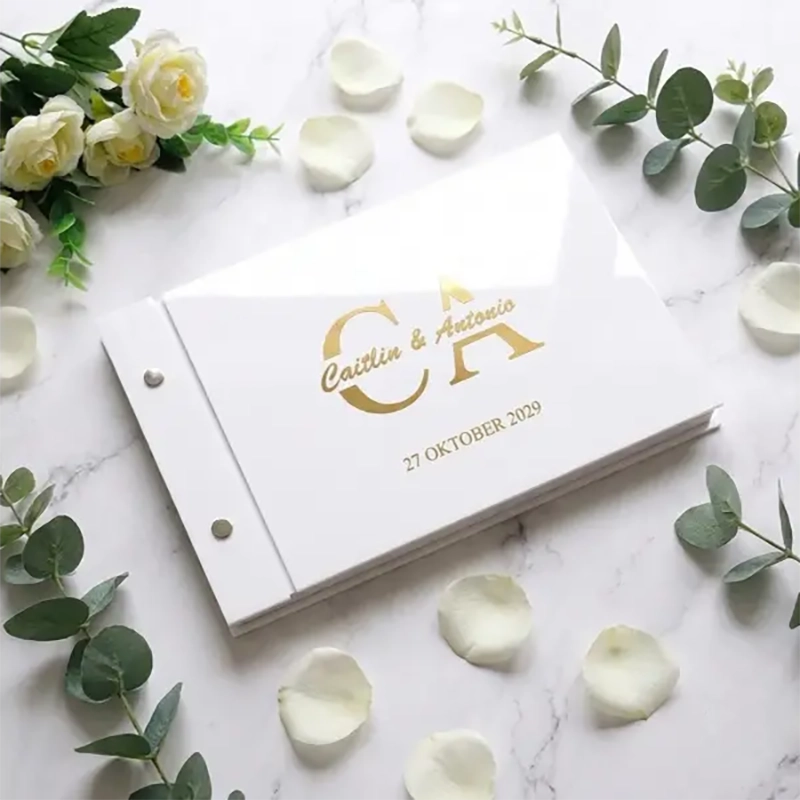Dit mirror acryl gastenboek met bold monogram design maakt een statement op de receptietafel. De grote overlappende initialen domineren de kaft en geven het gastenboek een stoere, eigentijdse uitstraling. Aangevuld met jullie namen en trouwdatum voor een persoonlijk resultaat.