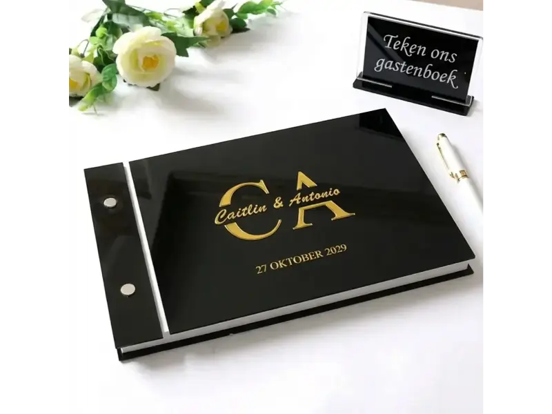 De kaft is verkrijgbaar in goud, wit en zwart. De printkleur kies je uit wit, zwart, goud of antraciet, zodat je de combinatie kunt afstemmen op jullie bruiloftsthema.