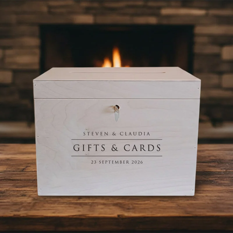 De doos wordt vervaardigd uit FSC-gecertificeerd berkenhout en haarscherp gegraveerd in eigen atelier. Jullie namen en trouwdatum worden met precisie toegevoegd aan het design. Dankzij het goudkleurige slot met sleutel blijven alle enveloppen veilig opgeborgen tijdens de receptie.