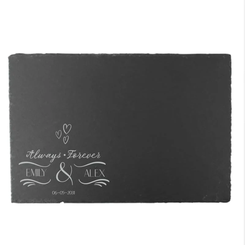 Het perfecte cadeau voor het bruidspaar: een prachtige leisteen serveerplank met een persoonlijke gravering. Laat ‘Always Together’, de namen en trouwdatum graveren op deze stijlvolle plank. Een blijvende herinnering aan hun speciale dag.