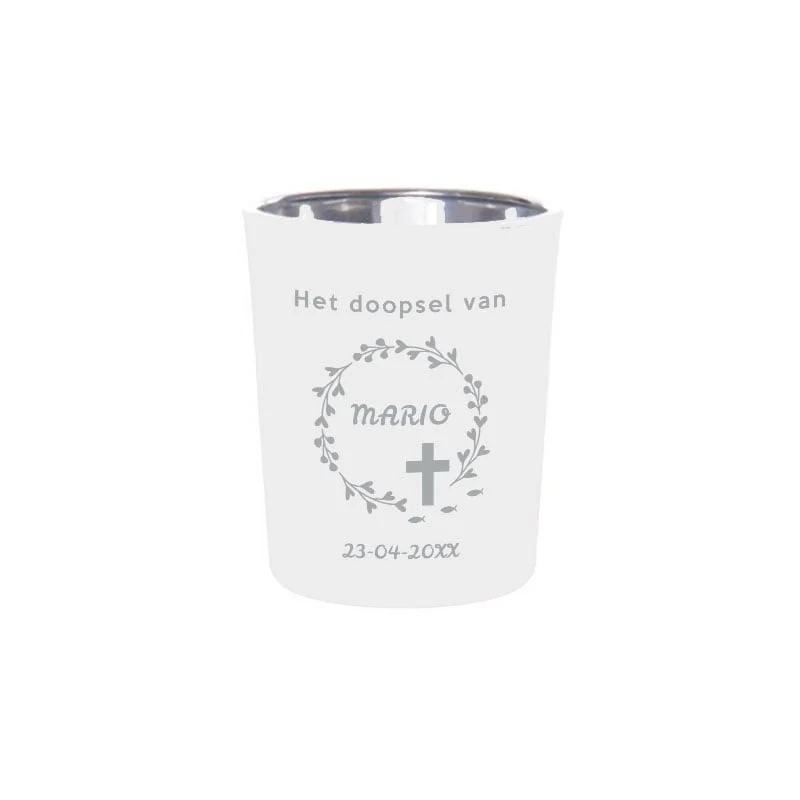 Geef jouw gasten een blijvende herinnering aan het heilige moment van het doopsel met onze “Krans van Geloof: Gepersonaliseerde Theelichthouder”. Een perfect bedankje om dankbaarheid te tonen voor hun aanwezigheid op deze bijzondere dag.