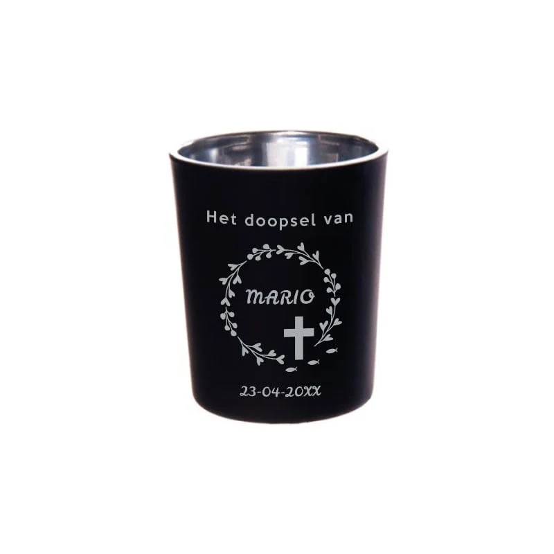 Breng een sfeer van devotie naar hun huis met onze “Krans van Geloof: Gepersonaliseerde Theelichthouder”. Deze elegante theelichthouder is gegraveerd met een betekenisvolle krans en biedt ruimte voor een gepersonaliseerde touch met de naam en datum van het doopsel.