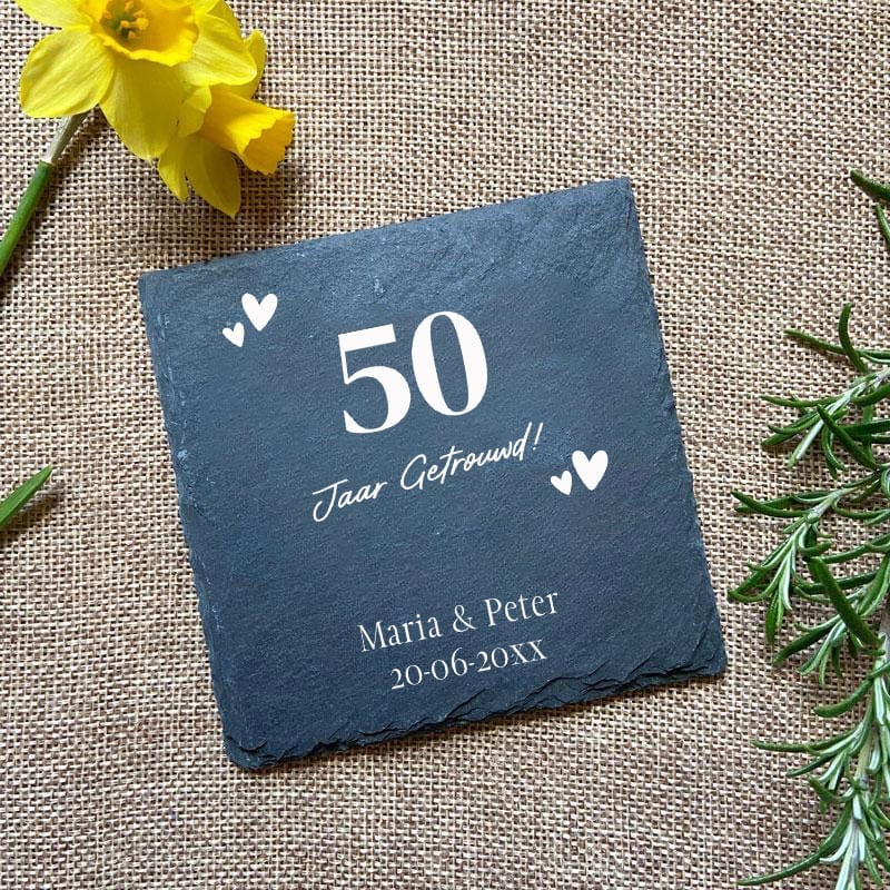 Vier een speciaal jubileum op een unieke en praktische manier met onze Persoonlijke Leisteen Onderzetters in Bamboe Box! Stel je voor: een set van 6 natuurlijke leisteen onderzetters, elk met een persoonlijke touch die jouw liefdesverhaal vertelt.