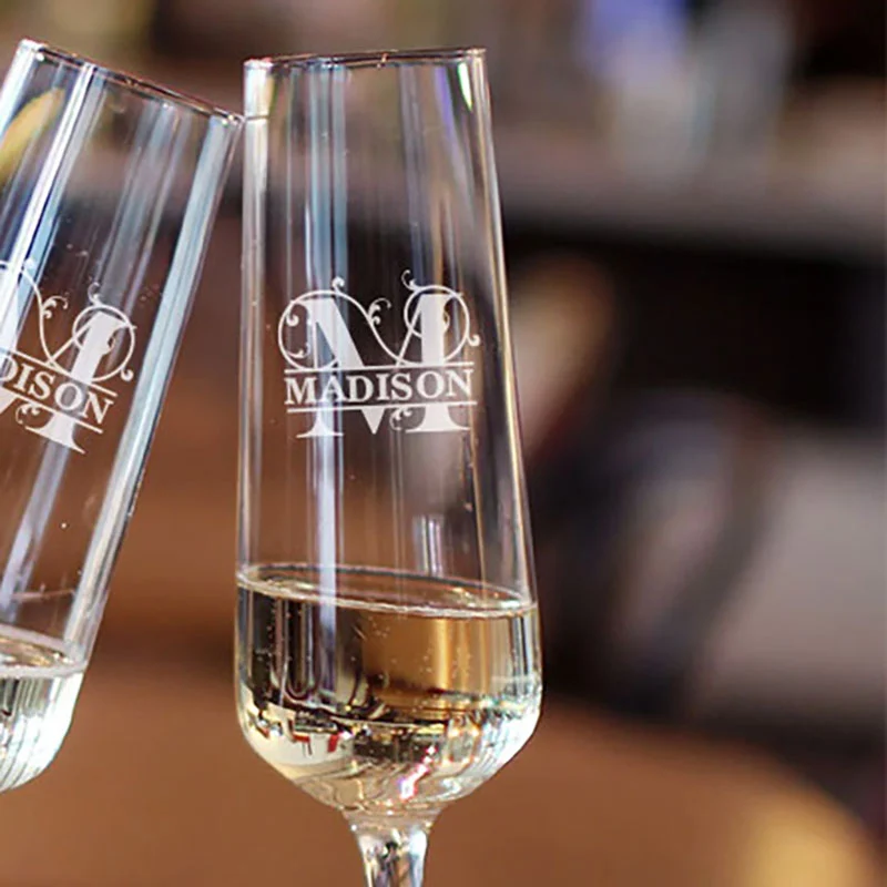 Dit ontwerp is de favoriet van bruidsparen die zoeken naar een balans tussen traditie en een moderne look. Het modern champagneglas met initiaal wordt met uiterste precisie gegraveerd op hoogwaardig kristalglas. Dankzij het verfijnde font is dit glas ook perfect voor een vrouwelijke getuige of als een elegant cadeau voor een collega die een mijlpaal viert.