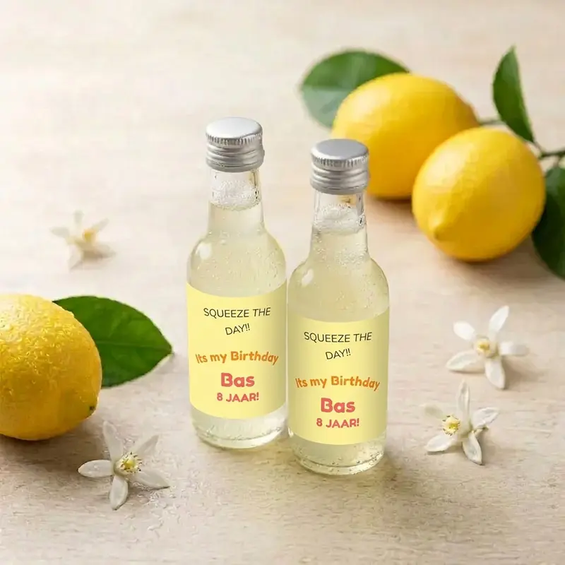 Na een geslaagd kinderverjaardagsfeestje verdient elk kind een leuk bedankje om mee naar huis te nemen. Deze mini flesjes met het vrolijke “Squeeze the Day” etiket zijn precies dat. Bedrukt met de naam en leeftijd van de jarige, zodat elk bedankje echt persoonlijk is.