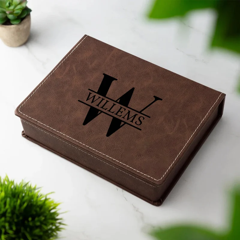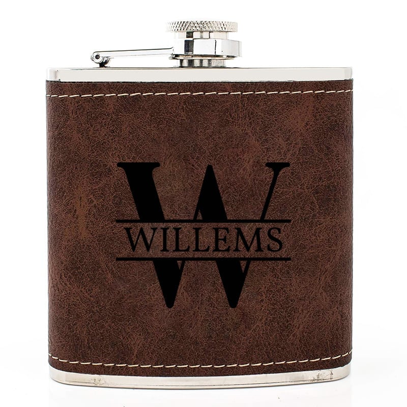 De heupfles is vervaardigd uit hoogwaardig PU-leer, met een stijlvolle afwerking en nette witte stiksels. Het luxe roestvrijstalen interieur en de eco-leer accessoires maken de set niet alleen praktisch, maar ook een statement van klasse. Gepersonaliseerd met een groot split monogram initiaal en een naam, wordt deze set een onvergetelijk cadeau voor elke whisky liefhebber.