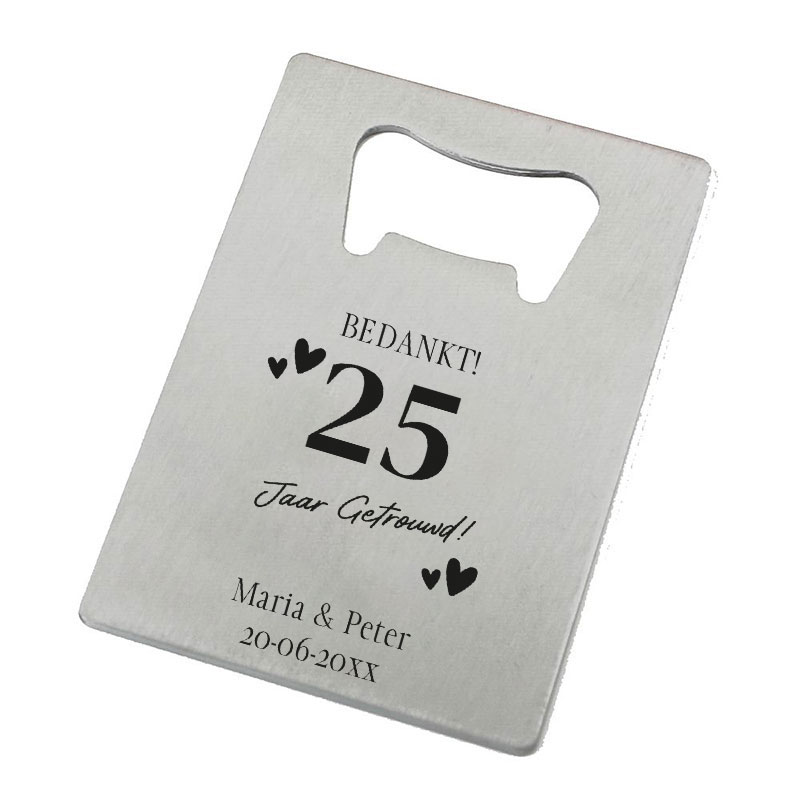 Vier een bijzondere mijlpaal met onze gepersonaliseerde ‘Zoveel Jaar Getrouwd’ RVS Flesopener! Deze stijlvolle flesopener, gemaakt van duurzaam roestvrij staal, is het perfecte bedankje voor je huwelijksjubileum. Personaliseer met een speciale gravure zoals “25 jaar” of “50 jaar getrouwd, bedankt” en voeg twee regels tekst toe (bijv. namen en datum) voor een uniek aandenken. Ideaal om je gasten te verrassen tijdens een jubileumfeest of speciale gelegenheid💍